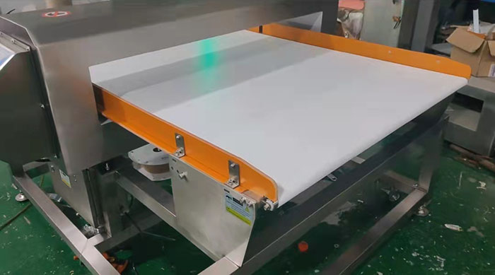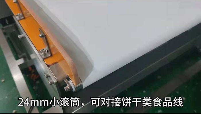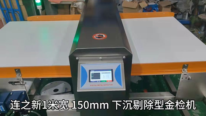 連之新1米寬150mm下沉剔除型金檢機介紹:觸摸屏控制,24mm小滾筒,可對接餅干類食品生產(chǎn)線