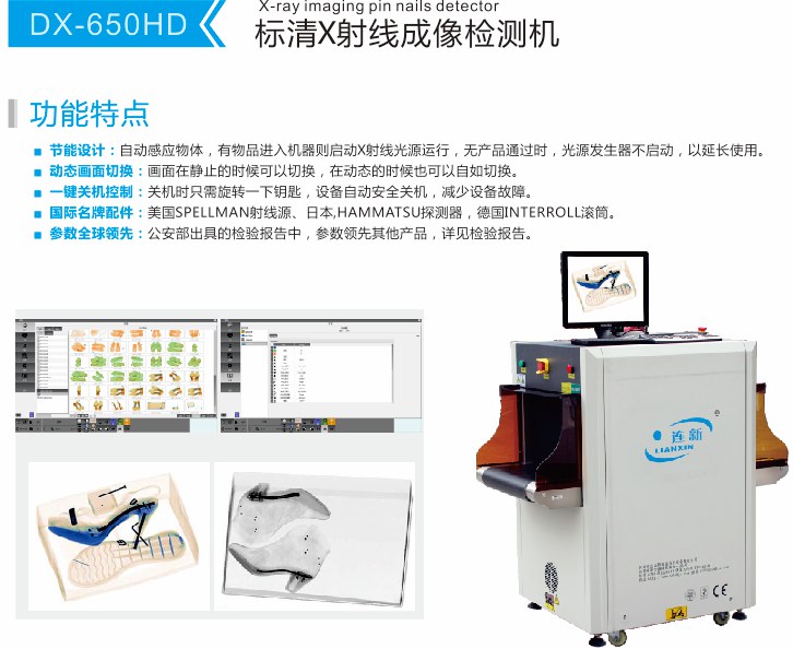 DX-650HD X光鞋子驗針機(jī),是一款標(biāo)清的X光驗針釘設(shè)備,適合用于鞋子手袋箱包等工業(yè)生產(chǎn)質(zhì)量檢測場所,是檢品環(huán)節(jié)一款重要的檢測儀器。